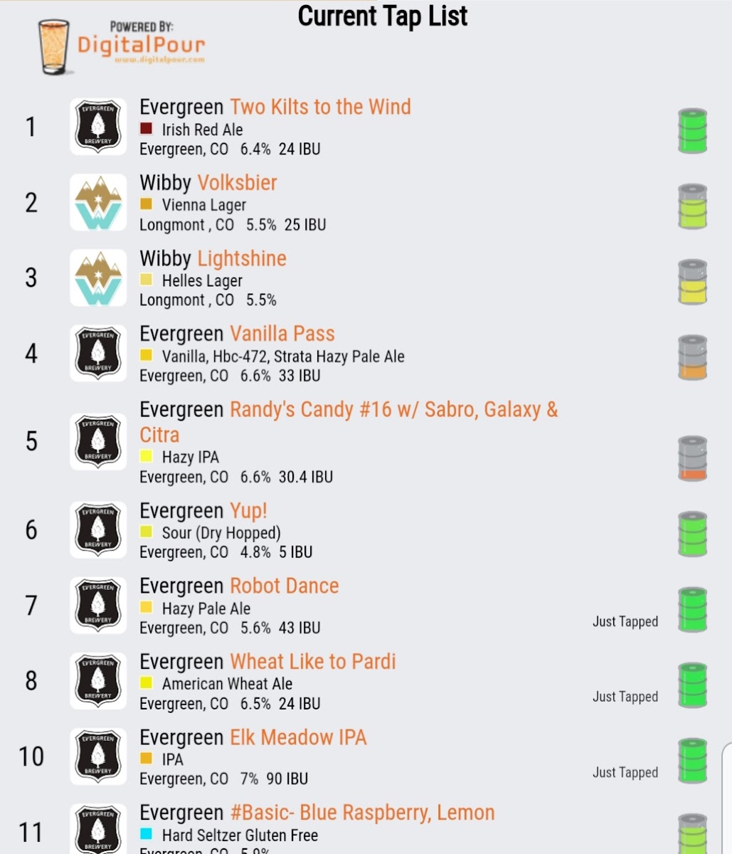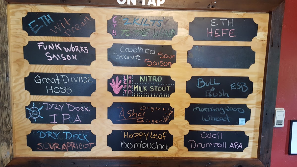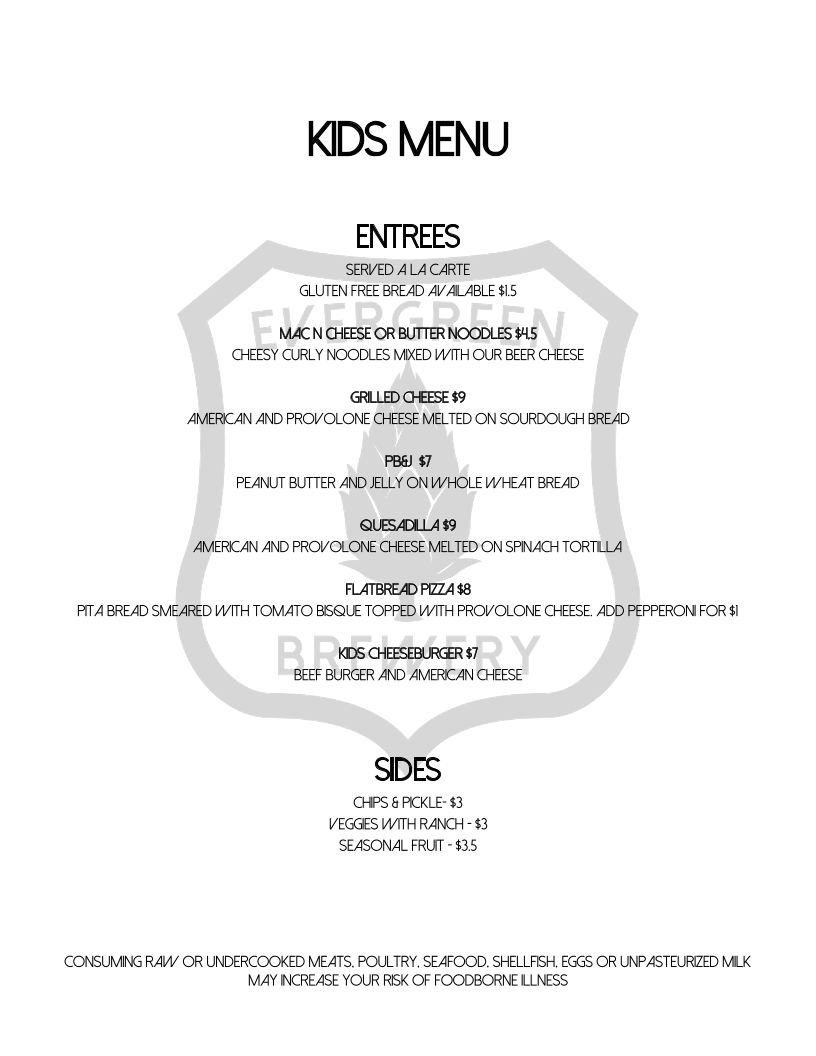 The menu offers a diverse selection of food and drinks typical of a brewery and American-style restaurant, suitable for brunch, casual dining, and light meals. It features a variety of beers, including specialty IPAs, stouts, ciders, and seasonal brews. Beverage options also include juices and other non-alcoholic drinks.